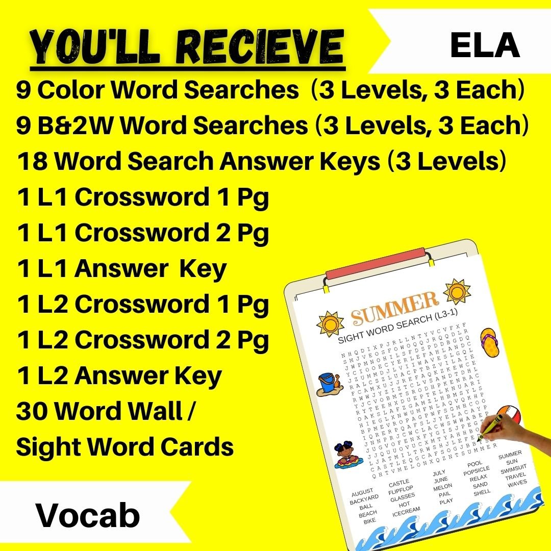 Let's Dive into some Summer Fun with our Summer Crossword Puzzle / Word Search Sight Word Worksheets. This worksheet packet is available in three differentiated levels! You will get crossword puzzles and word searches all based on 30 summer sight words. These worksheets provide 18 word searches (three for each level) with answer keys, four crossword puzzles (two levels) with answer keys, and 30 sight word cards with pictures (great for a literacy center or to send home for summer practice!! The word searches are in both color and black & white for easier printing!