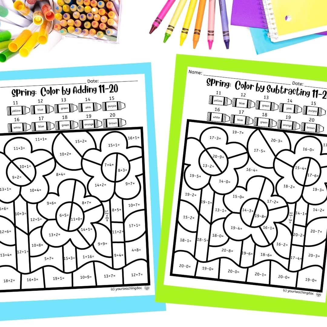 Level 3: 4 “Add the Numbers” Color By Code Worksheets (2) 1-10 (2) 11-20