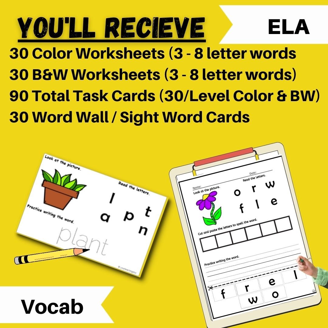 Spring into Learning with These Sight Word Literacy and Learning Worksheets, Task Cards & Vocab/Word Wall Cards! These Spring inspired worksheets will help your student blossom into a confident reader. As students develop their literacy skills, it’s important to provide them with a variety of activities that reinforce spelling, vocabulary, and sight word recognition. Functional reading skills such as identifying letters, unscrambling letters to make words and reading basic sight or functional words are critical to successful daily living.