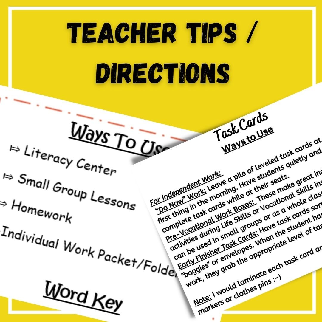 Remedial activities, small group lessons, introduction to reading or spelling, as well as functional ELA time are great ways to incorporate these worksheets. These worksheets and task cards are in both color and black and white for easier printing.